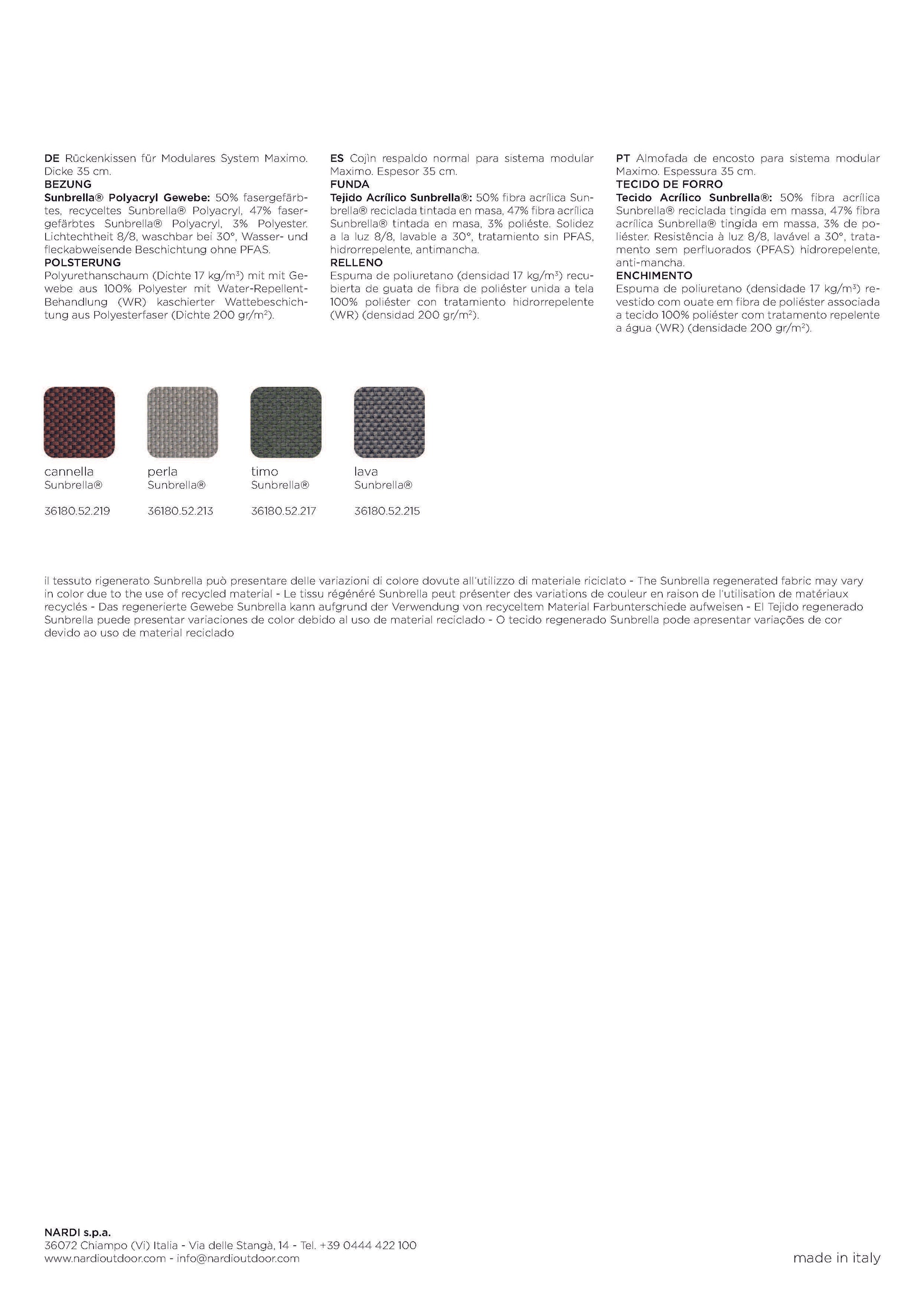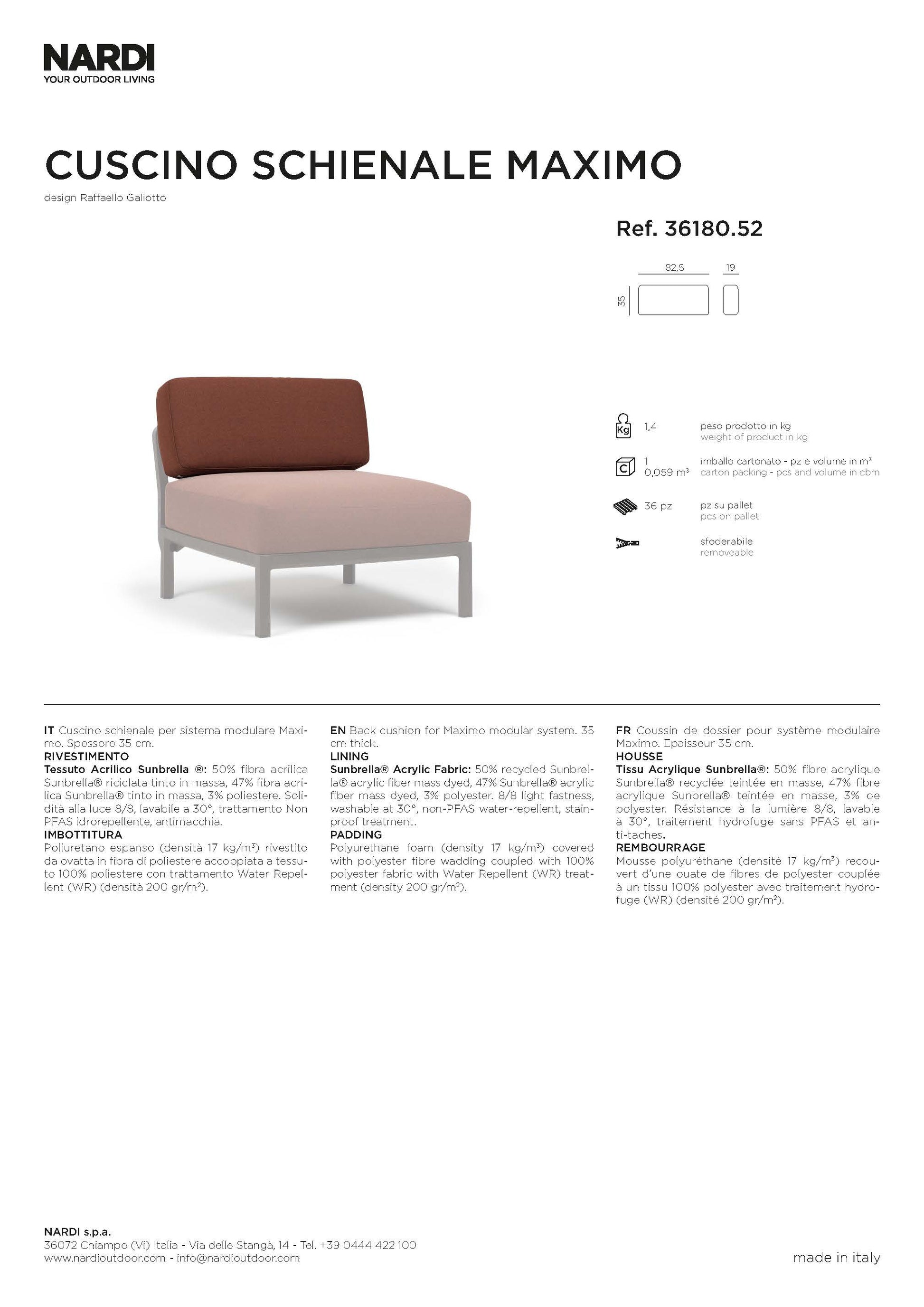 Der Cuscino Schienale Maximo ist das original Rückenkissen für das modulare Loungesystem Maximo von Nardi. Es sorgt für optimalen Komfort und stützt den Rücken angenehm ab – ideal für lange, entspannte Stunden im Freien. Mit seinem eleganten, wetterbeständigen Bezug fügt es sich nahtlos in das moderne Design der Maximo-Serie ein. Passend für alle Maximo-Module mit Schienale (Rückenlehne).