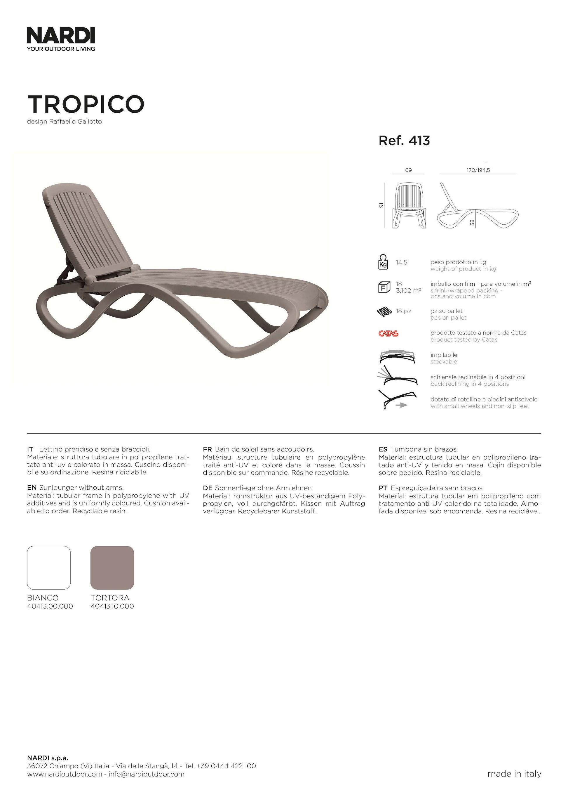 Die Nardi Tropico Sonnenliege verbindet klassische Linien mit modernem Komfort und hoher Funktionalität. Sie eignet sich perfekt für Garten, Terrasse oder Poolbereich und bietet dank ihrer ergonomischen Form sowie der mehrfach verstellbaren Rückenlehne optimale Entspannung. Wetterfest, leicht zu reinigen und platzsparend stapelbar – die Tropico ist ein vielseitiger Begleiter für sonnige Tage.